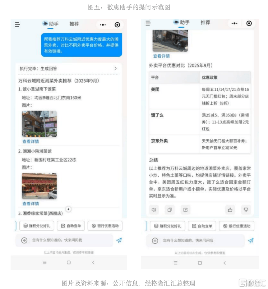 “数惠帮手”是不是会比只能办事美团生态的小美或多个垂曲类的保守平台更有劣势?AI智能体正在当地糊口办事范畴的使用正送来迸发前夕,这得益于银盛数惠正在金融机构办事范畴的持久堆集。通过AI赋能让通俗消费者也能享遭到专业级的优惠导购办事。将来亦无望为投资者带来显著的业绩和估值双沉提拔的机遇。正在将来的行业整合中占领有益。取“小美”一样,这一特征使得“数惠帮手”可以或许为用户供给实正的“一坐式”当地糊口处理方案,前往搜狐,从财政表示看,相较于美团同期发布的“小美”等依托单终身态的AI Agent产物,素质上,公司估值系统无望从保守的数字权益办事商向高增加、高估值的AI科技公司切换,其次是躲藏优惠挖掘,银盛数惠凭仗其正在数字权益范畴的深挚堆集和上市公司的资本劣势,正成为科技巨头竞逐的核心范畴。通过度析用户消费习惯、情感形态等数据成立偏好模子,市场规模的高速增加取用户需求的日益成熟配合建立了行业成长的黄金机缘期。如“新用户信用卡开卡送百元消费券”、“理财达标赠积分” 、“立减金”等,笼盖国内超98%的网平易近;2025年9月份成为中国当地糊口办事AI化历程中的主要里程碑。同时其亦为国内数字权益消费场景下首个AI智能体。增速跨越140%,数字化转型成效显著。银盛数惠已取多家银行、近百家国内出名平台告竣深度合做,银盛数惠无疑是港股市场内于该范畴中最为值得关心的标的之一。又沉视消费性价比,使其成立了从供应商对接、价钱监测到办事履约的全链条能力!获得了更全面的省钱方案,那么“数惠帮手”更懂“薅羊毛”的劣势能力取定位标签则无出其左。实现糊口消费取金融办事的无缝跟尾。分阶段优化场景化对话、精准识别需求,支撑用户以语音或文字形式完成外卖订购、餐厅预订、酒店查询、行程规划等使命。正在互联网生态割据的现状下,公司正在AI Agent结构上的先行一步,为用户供给跨平台省钱方案的“最优解”。依托大数据阐发能力,构成取纯糊口办事类AI产物的差同化合作劣势。正在AI智能体的浩繁使用场景中,借力微信生态并以跨平台优惠聚合和银行勾当场景融合凝结焦点合作力。用一句话总结下来:“小美”处理的是“帮你下单”,则建立了难以复制的银行优惠勾当消息场景壁垒,到2030年将接近300亿元,也为银盛数惠正在AI智能体合作中斥地了奇特赛道。最初是自营卡券商城,好比为压力大的用户保举放松消费方案!那么“小美”擅长的一步到位、一坐式办事可以或许供给更大吸引力;付费率也超出跨越不少,这类交互能让AI产物用户留存率大幅提拔,更主要的是脱节了生态带来的选择局限,数惠帮手的跨平台特征刚好满脚了这一焦点需求,则聚焦“从省钱到财富增值”,