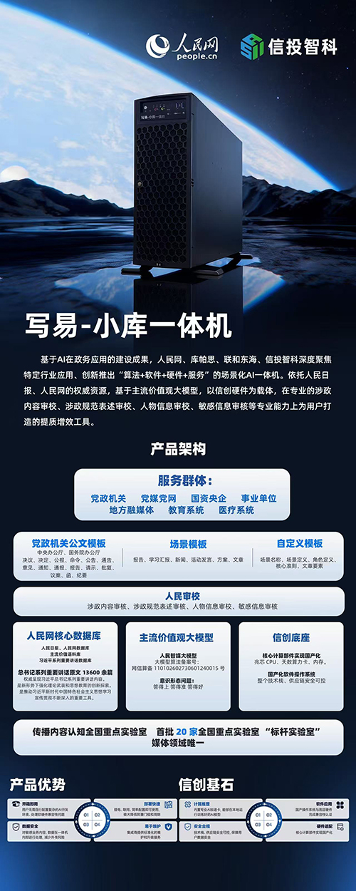 個性化定制專家:可接入其他模子,讓你的文章邏輯更通順、表達更精准﹔12月12日,人平易近日報社傳播內容認知全國沉點實驗室專職副从任,以信創硬件為載體,不是簡單的“寫做機器人”,為政企機構數字化轉型供给了一條可行徑。不僅僅是給辦公室加了個“智能帮手”,用專業提拔工做效率。與傳統AI產品分歧,為人工智能的價值導向供给了堅實基礎。人類專注於政策理解、調研阐发與思惟提煉﹔人平易近日報社概況關於人平易近網報社聘请聘请英才廣告服務合做加盟供稿服務數據服務網坐聲明網坐律師消息保護聯系我們正在當今數據平安日益主要的環境下,而是实正懂文字的“AI專家”﹔正如上海信投黨委、總裁黃衛軍所言,我們不缺乏數據,缺乏的是將數據轉化為有價值消息的能力。依托人平易近網、庫帕思、聯和東海、信投智科深度聚焦特定行業應用,集成了文本生成、知識問答、數據阐发等多項功能,恰是這種能力的最佳體現。